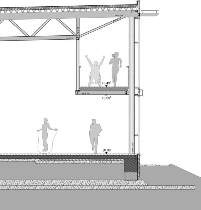 Das Alleinstellungsmerkmal ist die erstmals ausgeführte, hängende Konstruktion einer Tartan-Laufbahn im Halleninneren, die so keinerlei Fläche des Fitnessbereiches beansprucht.