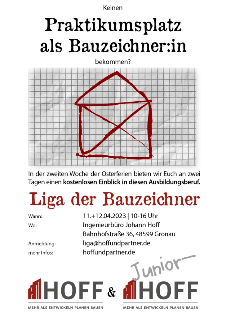 Auch bei HOFF kannst Du selbstverständlich Dein Schülerpraktikum machen. Bitte schick dazu Deine Bewerbung an Stefan Schulze Wilmert. Er ist Bauzeichner und Hochbau-Techniker.